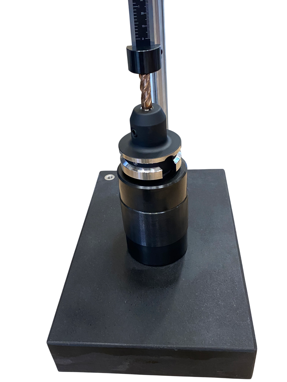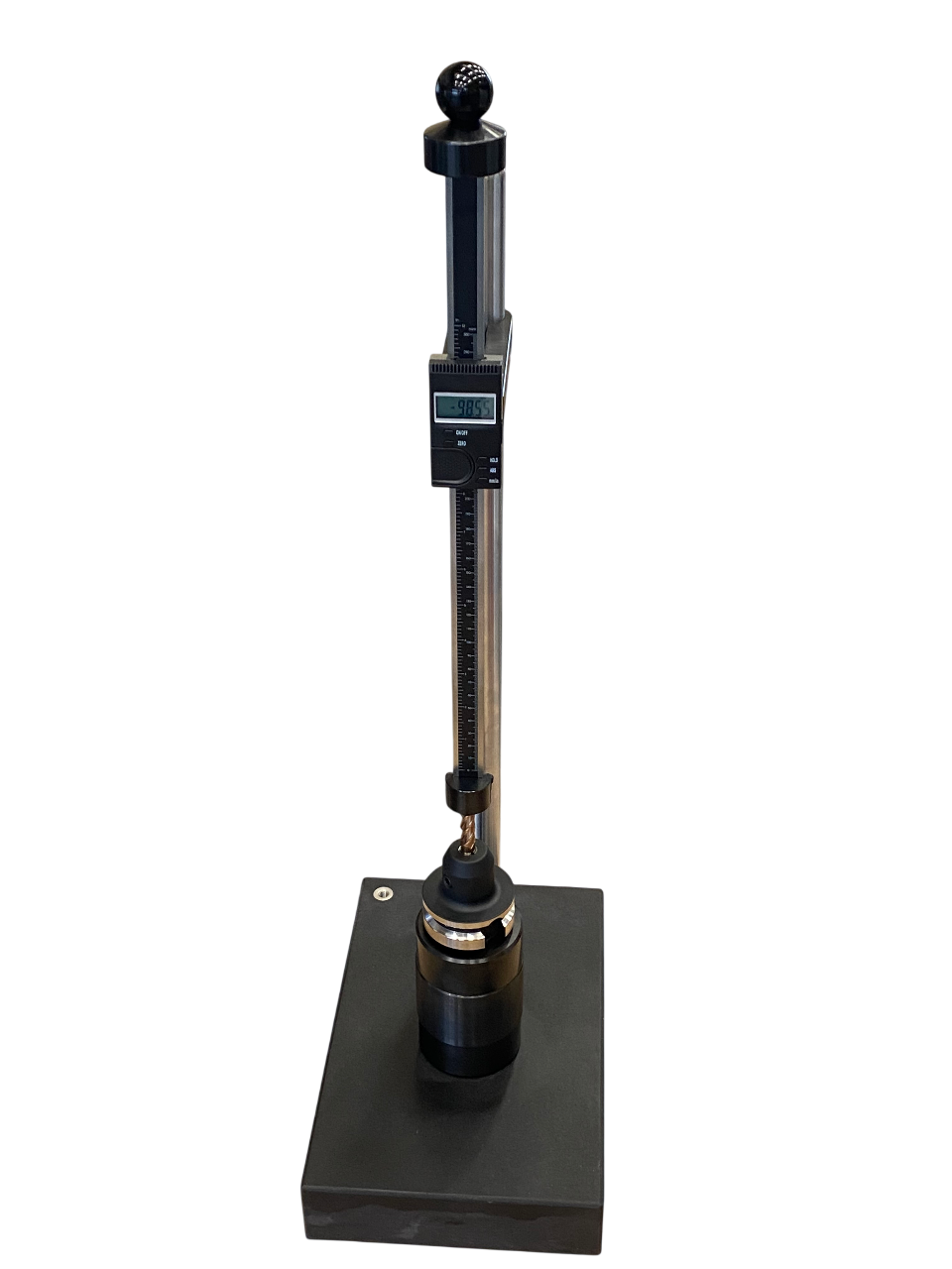 Einfacher Toolsetter mit Präzisions-Steinplatte, elektronischem Tiefenmessschieber sowie wahlweise einem Werkzeugaufnahmeblock mit SK40- oder SK30-Konus.